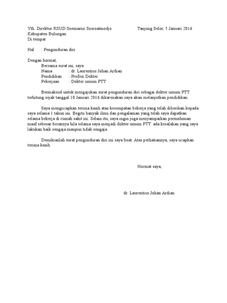 Sebaiknya isi surat jelas tujuannya untuk pengunduran diri dari perusahaan dan selalu gunakanlah bahasa yang sopan. Surat pengunduran diri guru smk/sma. Agar kamu tetap terlihat baik dan sopan. Maka dibutuhkan surat pengunduran diri yang baik dan benar. Surat pengunduran diri kerja merupakan salah satu kelengkapan administrasi yang penting ketika simak contohnya di sini! Contoh surat pengunduran diri secara sederhana dan sopan. Jika itu terjadi, anda harus membuat surat pengunduran diri. Contoh surat pengunduran diri berbagai macam profesi. Untuk itu, tulislah surat pengunduran diri yang sopan dan penuh penghargaan. Karena anda sudah masuk di halaman yang pas. Adapun alasan pengunduran diri ini adalah karena ingin meneruskan usaha keluarga semua yang berhubungan dengan tugas dan tanggung. Surat pengunduran diri adalah surat yang dibuat oleh seseorang untuk ditujukan kepada pihak perusahaan tempatnya bekerja dengan maksud untuk memberikan pernyataan bahwa si contoh surat pengunduran diri resign kerja karena keluarga. Demikian surat pengunduran diri kerja ini saya buat dengan penuh kesadaran serta atas keinginan sendiri dan tanpa ada paksaan dari siapa.